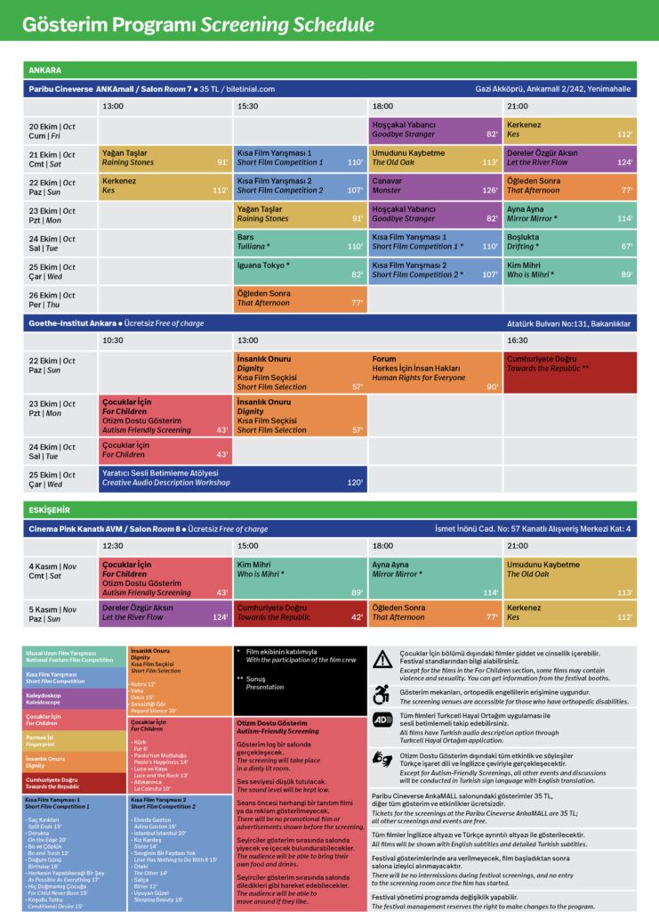 Festival programında yer alan tüm gösterimler, sesli betimleme ve ayrıntılı altyazı ile izlenebilecek. Gösterimlerin ardından, film ekipleriyle yapılacak söyleşilerde, forumlarda ve atölyelerde işaret dili tercümesi yapılacak. “Çocuklar İçin” bölümü dışındaki tüm gösterimler ve etkinlikler İngilizce olarak da takip edilebilecek.