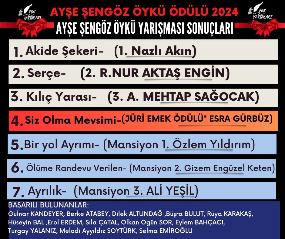 FGK Yayınları tarafından düzenlenen 2024 “Ayşe Şengöz Öykü Ödülü” 23 Kasım 2024 Cumartesi saat 21’de FGK TV’de Canlı Yayında açıklandı.