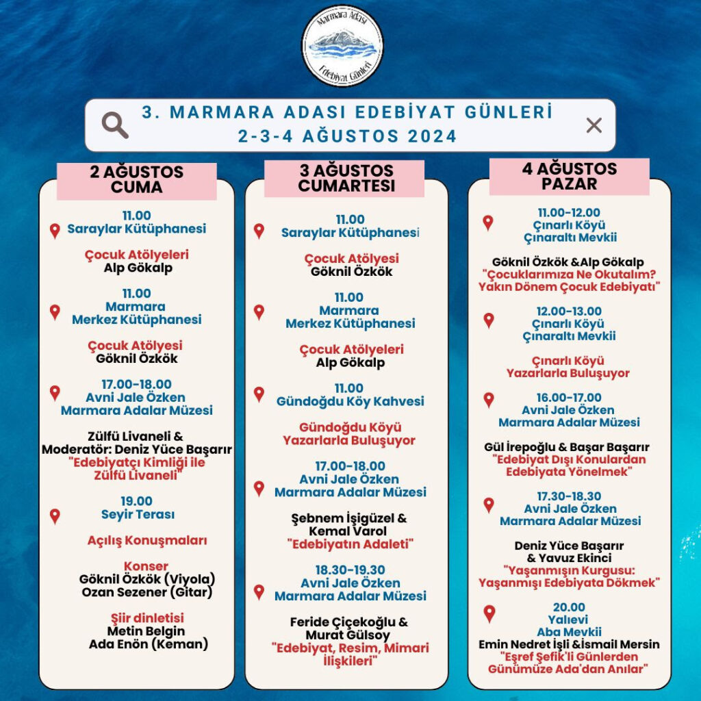 50’li 60’lı yıllardan başlayarak bir dönem yazarlarının, sanatçılarının tatil mekânı olan, ada yaşamına karışıp eserlerini yazdıkları, balıkçılarla balığa çıkıp ada sakinleriyle dostluklar kurdukları Marmara Adası’nda, edebiyat rüzgârlarını yeniden estirmek amacıyla gerçekleştirilen Edebiyat Günleri bu yıl yine tanınan, sevilen yazarları ağırlıyor.