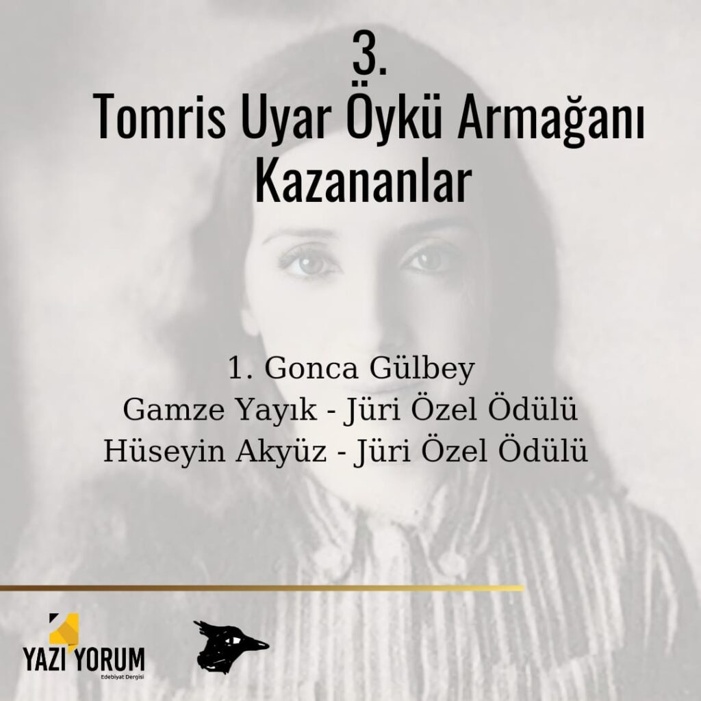 Tomris Uyar Öykü Armağanı kazananları belirlendi. M. Sadık Aslankara, Berna Durmaz, Murat Yalçın’ın seçici kurulda yer aldığı yarışmanın birinciliği Gonca Gülbey alırken, Gamze Yayık ve Hüseyin Akyüz Jüri Özel Ödülü’ne layık görüldüler.
