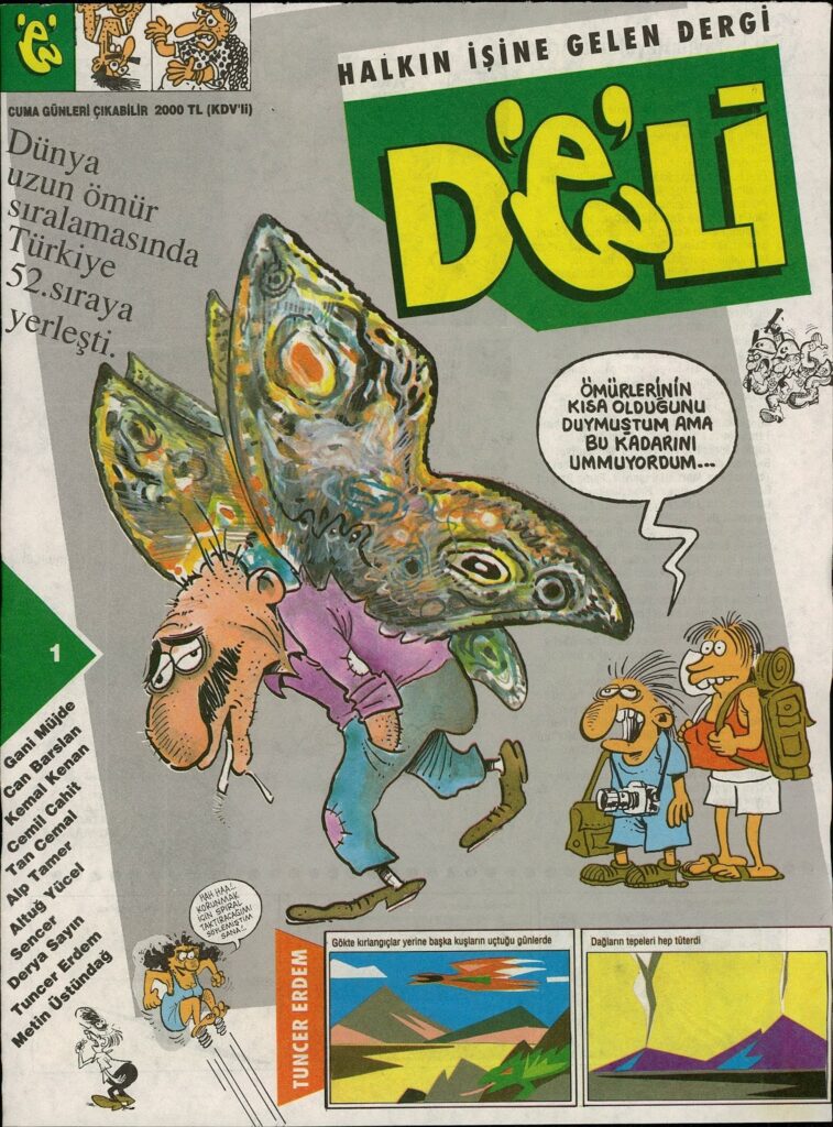 Deli Dergisi’nin ilk sayısı 2 Ağustos 1991’de çıkmış. İlk sayının künyesinde “Yazar/çizerler (‘Deliler’): Can Barslan, Gani Müjde, Metin Üstündağ, Sencer, Kemal Kenan, Derya Sayın, Alp Tamer, Tuncer Erdem, Cemil Cahit ve diğerleri” diye yazılmış. “Diğerleri”nin arasında da kıymetli adlar var ve dergiyi daha sonra onlar yürütecekler.