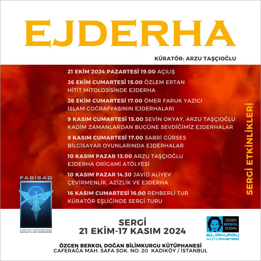 Resim, heykel, edebiyat ve müzik alanlarında eser veren sanatçıları ejderha teması etrafında buluşturan sergi, Özgen Berkol Doğan Bilimkurgu Kütüphanesi’nin ev sahipliğinde açılan sergi, 17 Kasım’a kadar devam edecek. Dört hafta boyunca çeşitli etkinlikler de gerçekleşecek.