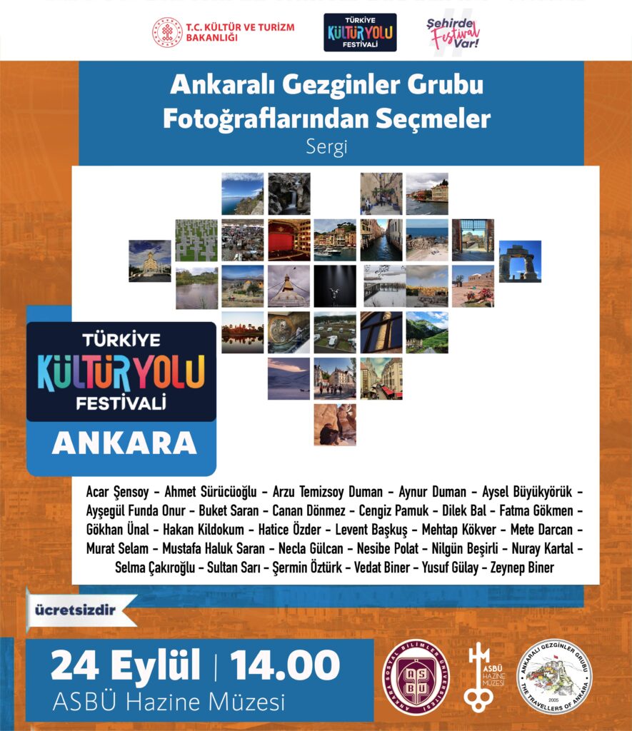 Ankaralı Gezginler Grubu’nun, Başkent Kültür Yolu Festivali kapsamında ASBÜ Hazine Müzesi’nde düzenleyeceği “Ankaralı Gezginler Grubu Fotoğraflarından Seçmeler” sergisi 24 Eylül Salı günü saat 14.00′ te gerçekleşecek.
