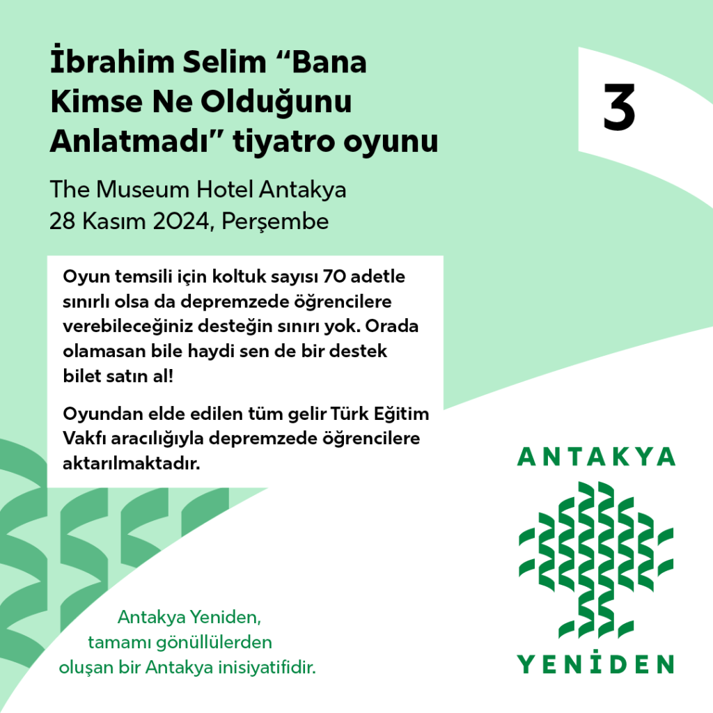İbrahim Selim “Bana Kimse Ne Olduğunu Anlatmadı” Tiyatro Oyunu: Sanatçı, The Museum Hotel Antakya’da sergilenecek oyunu ile projeye gönüllü olarak destek vererek Antakya’nın yeniden doğuşuna katkıda bulunacak.