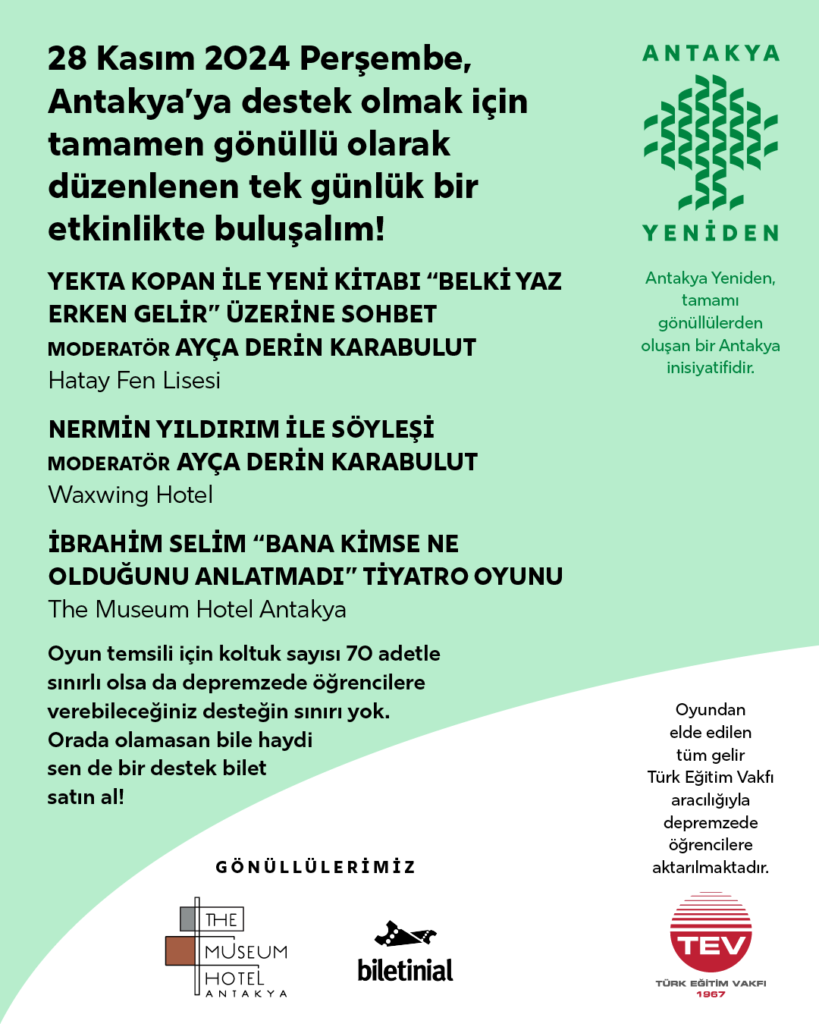 28 Kasım’daki etkinlikler için sınırlı sayıdaki biletler, Biletinial üzerinden satışa sunuluyor. Bilet bulamayanlar veya etkinliğe katılamayanlar için “Antakya’ya destek bileti” alma seçeneği sunuluyor. Bu destek biletleri, bölgedeki öğrencilere yardım sağlamak için önemli bir adım olacak.