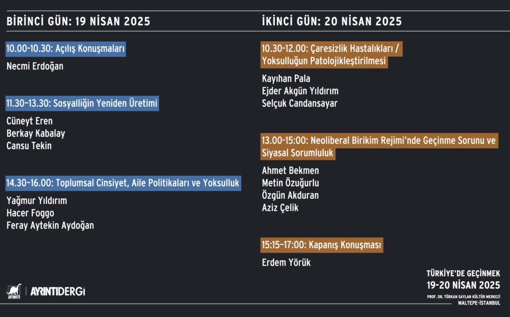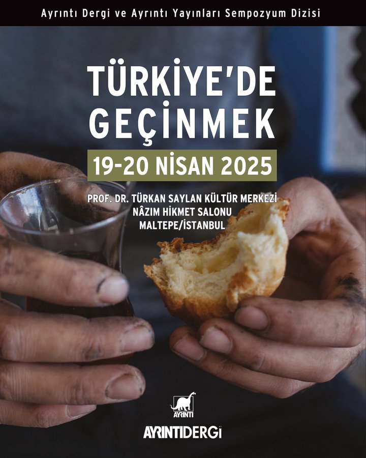 Ayrıntı Dergi ve Ayrıntı Yayınları düzenlediği Türkiye’de Geçinmek Sempozyumu Prof. Dr. Türkan Saylan Kültür Merkezi Nâzım Hikmet Salonu Maltepe/ İstanbul’da 19 – 20 Nisan’da gerçekleşecek.