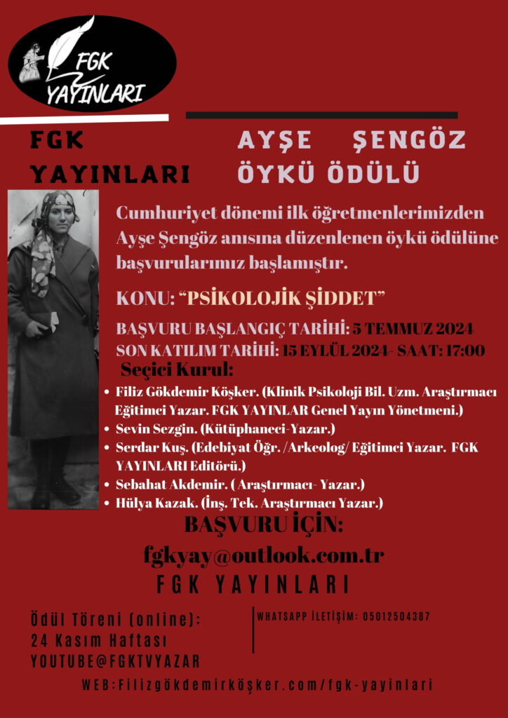 Ayşe Şengöz’ün torunu FGK YAYINLARI Kurucusu Klinik Psikoloji Bil. Uzm. Araştırmacı Eğitimci Yazar Filiz Gökdemir Köşker’in önderliğinde düzenlenen öykü yarışmasına, on sekiz yaşını geçmiş herkes; daha önce bir kitapta veya dergide yayımlanmamış, herhangi bir dijital platformda yer almamış özgün eseriyle 15 Eylül 2024 tarihine kadar başvuru yapabilecektir.