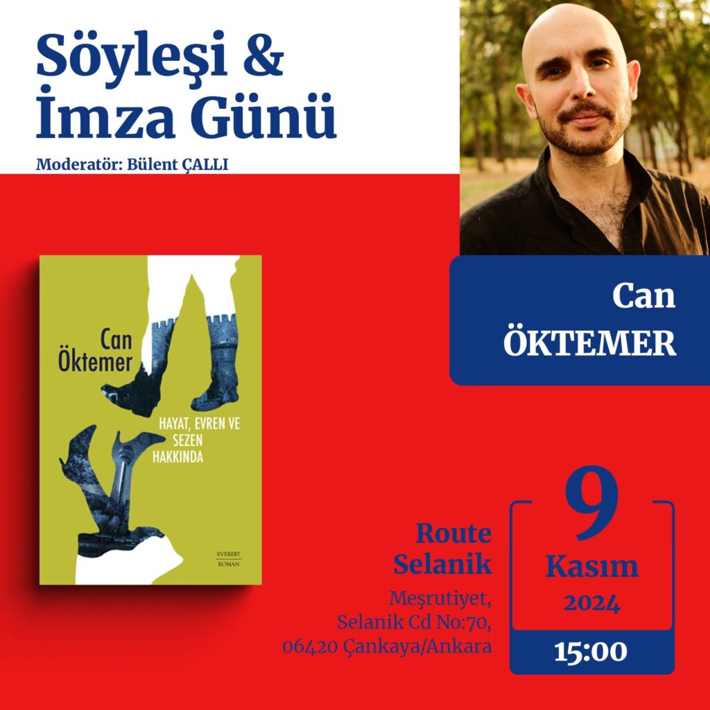 ‘Hayat, Evren ve Sezen Hakkında’ adlı romanı Everest Yayınları tarafından yayımlanan Can Öktemer, 9 Kasım Cumartesi günü saat 15.00’te Bülent Çallı moderatörlüğünde kitabını anlatacak.