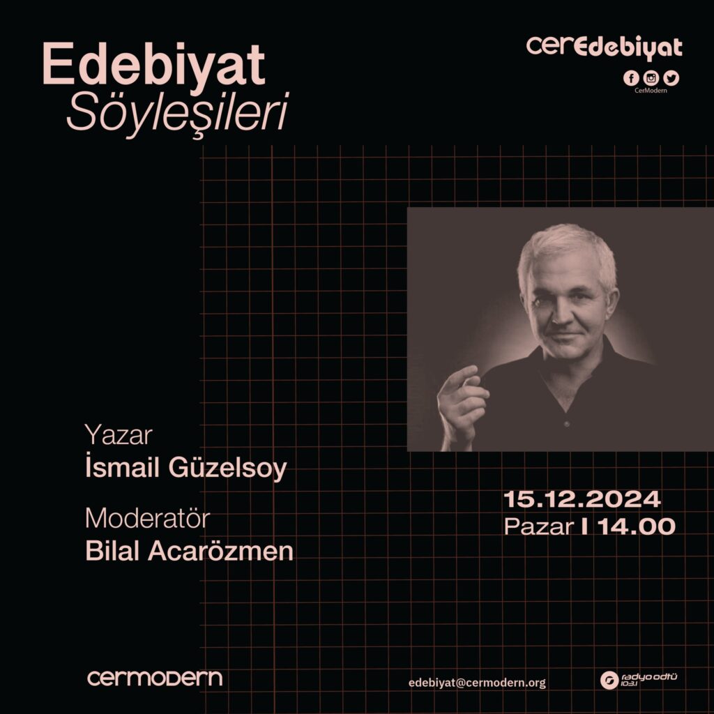 CerEdebiyat söyleşilerinin aralık ayındaki konuğu İsmail Güzelsoy olacak. Bilal Acarözmen’in moderatörlüğünde gerçekleşecek söyleşi, 15 Aralık Pazar günü saat 14.00’te olacak. Etkinlik herkese açık ve ücretsizdir.
