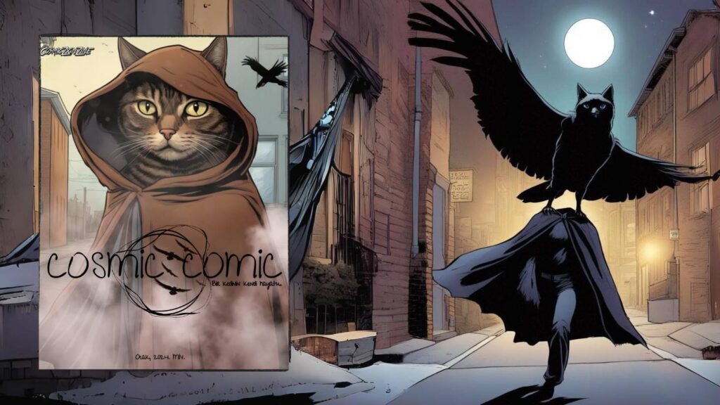 Cosmic Comic hikâyesinin temelini yuvarlak yeşil gözlü koyu kahverengi tekir kedi ile sıradan bir karganın sokakta tanışmasının ardından yaşadıkları hayatta kalma mücadelesi oluşturuyor. Kedi, evden kaçtığı gün itibariyle sokak yaşamının zorluklarıyla yüzleşirken, sokağın kurallarını ve hayatta kalma içgüdülerinin çizgisini çizmeye çalışıyor. Diğer taraftan, karga ise sokağın, gecenin, açlığın ve hayatta kalma mücadelesinin tüm yönlerini deneyimlemiş olmasına rağmen, sürüden atılmış olmanın getirdiği zorluklarla başa çıkmaya çalışıyor.