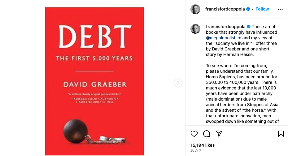 Ünlü yönetmen Coppola, yeni filmine ilham olan, David Graeber’ın Everest Yayınları tarafından Türkçeye kazandırılan “Debt” (“Borç“) adlı kitabını paylaştı.
