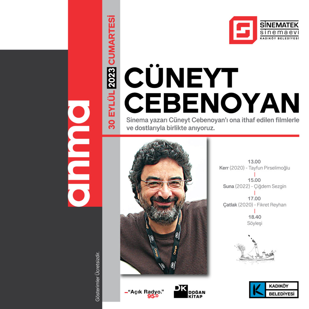Kadıköy Belediyesi Sinematek/Sinema Evi, 2019 yılında geçirdiği trafik kazası sonucu hayatını kaybeden sinema yazarı ve film eleştirmeni Cüneyt Cebenoyan için anma etkinlikleri düzenliyor. Türkiye’nin önemli sinema eleştirmenleri arasında gösterilen Cüneyt Cebenoyan’a ithaf edilen 3 film, 30 Eylül Cumartesi günü Sinematek/Sinema Evi’nde seyirciyle buluşacak. Gösterilecek filmler arasında Tayfun Pirselimoğlu’nun yönettiği polisiyeden korkuya uzanırken yer yer karanlık mizahıyla nefes aldıran tekinsiz bir konunun anlatıldığı “Kerr” filminin yanı sıra Çiğdem Sezgin’in yönettiği özgür bir kadın öyküsü “Suna” ve Fikret Reyhan’ın yönettiği bir borcun yarattığı ahlaki çatışmayı incelikle anlatan “Çatlak” filmi de yer alıyor. Gösterimlerin ardından filmlerin yönetmenleri de Cebenoyan’ın dostlarıyla söyleşi gerçekleştirecek.
