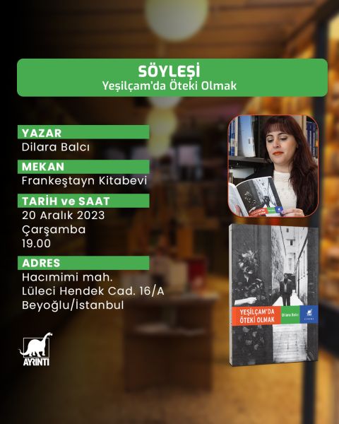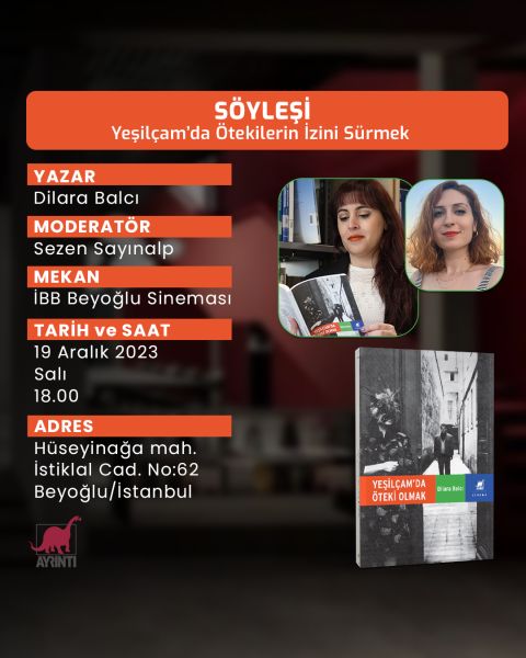 Sinema tarihimiz üzerine birçok çalışması, film, afiş ve fotoğraf koleksiyonu bulunan Yaşar Üniversitesi Film Tasarımı Bölümü Dr. Öğretim Görevlisi Dilara Balcı, Ayrıntı Yayınları’ndan çıkan Yeşilçam’da Öteki Olmak adlı kitabı üzerine gerçekleştireceği söyleşilerde okurlarıyla buluşacak. Balcı, 19 Aralık Salı akşamı saat 18.00’de İBB Beyoğlu Sineması’nda, psikolog, sinema yazarı ve çizer Sezen Sayınalp moderatörlüğünde “Yeşilçam’da Ötekilerin İzini Sürmek” başlıklı bir söyleşi gerçekleştirecek. 20 Aralık Çarşamba akşamı saat 19.00’da ise Frankeştayn Kitabevi’nde okurlarıyla buluşacak olan Dilara Balcı, ücretsiz olarak düzenlenen söyleşilerin ardından Yeşilçam’da Öteki Olmak kitabını da okurları için imzalayacak.