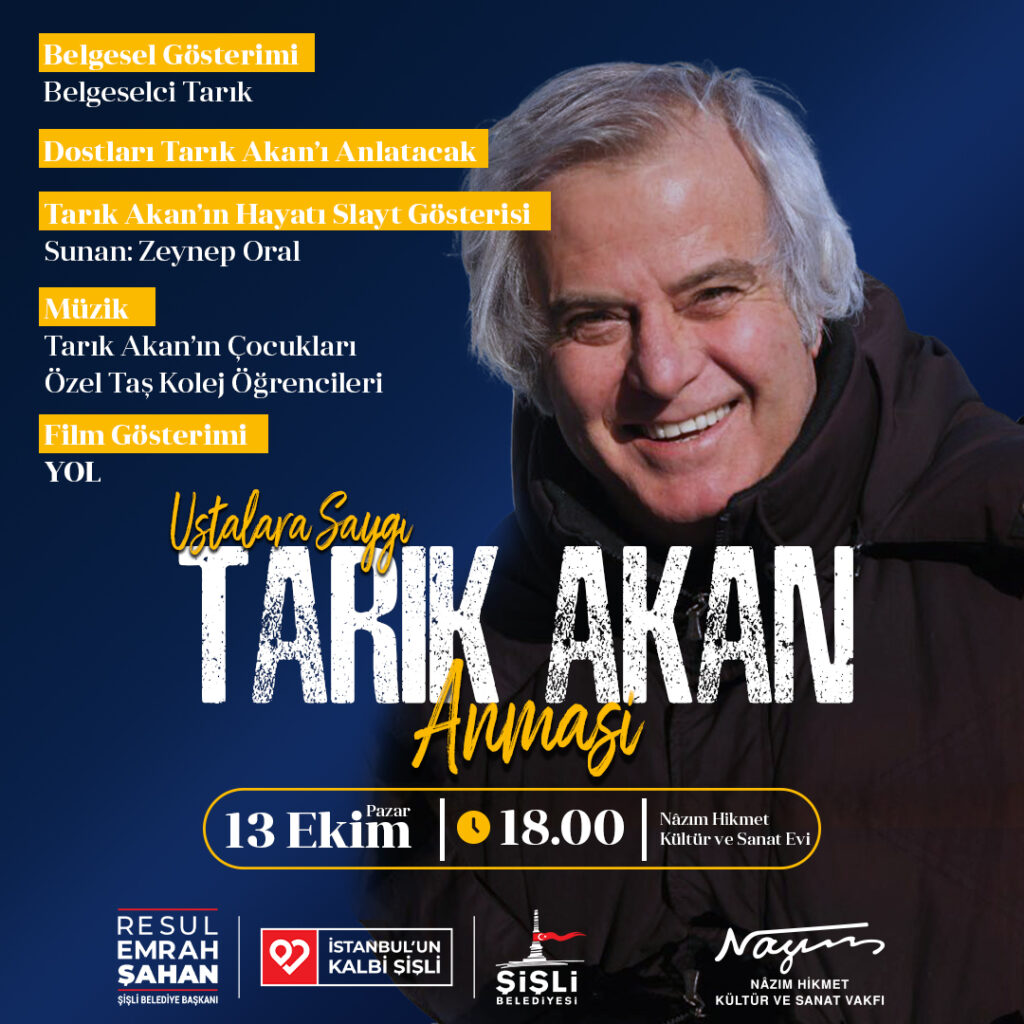 Nâzım Hikmet Vakfı organizasyonunda, Şişli Belediyesi katkılarıyla 13 Ekim’de Tarık Akan 75. yaşında anılacak. Etkinlik saat 18.00’de Şişli Nâzım Hikmet Kültür ve Sanat Evi’nde anma programı düzenlenecek.