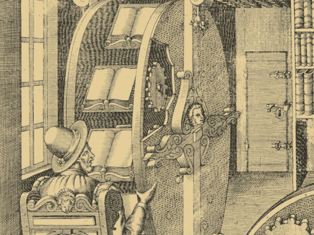 “Kitap tekerleği, aynı yerde birkaç kitap okunabilmesini sağlayan düzenektir. Kitaplar su değirmenine benzer bir mekanizmanın döndürülmesiyle okuyucunun önüne gelir. İlk kitap tekerleği, büyük ebatlı ağır kitapların pratik zorluklar çıkardığı 1588’de İtalyan askerî mühendis Agostino Ramelli tarafından çizilmiştir. Saatlerde kullanılan çark sistemini uyarlayan Ramelli, düzenek sayesinde, hareket zorluğu çeken gut hastalarının çok hareket etmeye gerek duymadan birkaç kitaba birden ulaşabileceklerini belirtmiştir. Çağdaş bir yazar bu aracı “16. yüzyılın Kindle”ı diye isimlendirmiştir. Öte yandan Çin bilimi tarihçisi Joseph Needham, Ramelli’ninki gibi dikey çalışmasa da, Çin’de kitap tekerleğinin belki bin yıl önce icat edildiğini söylemiştir.” (Z Dergisi | Kültür Sanat Şehir | Mevsimlik Tematik Dergi Kitap Tekerleği).
