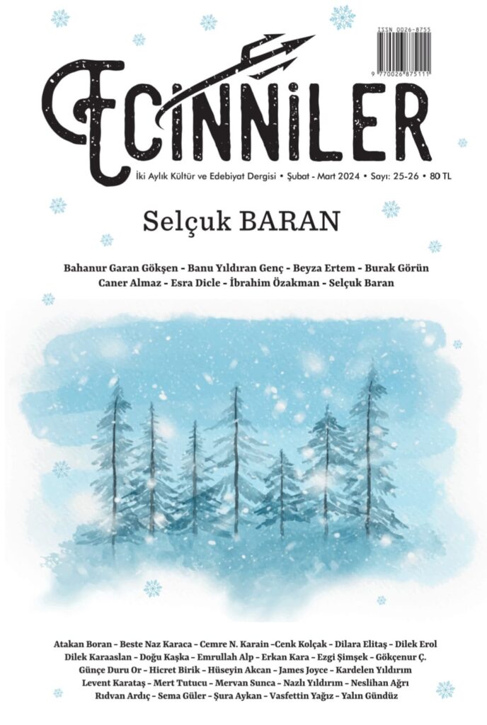İki aylık kültür ve edebiyat dergisi Ecinniler, 25-26. birleşik sayısını yayımladı. Yayıncılık dünyasını derinden sarsan ekonomik sıkıntılar sebebiyle gecikmeli ve birleşik olarak yayımlanan yeni sayı raflarda. 2024 yılının ilk dosyası, edebiyatımızın usta kalemi Selçuk Baran’ı ve eserlerini konu alıyor. Yayın kuruluna yeni katılan Beyza Ertem’in editörlüğünde hazırlanan sayıda Beyza Ertem ile Esra Dicle’nin söyleşisi yanı sıra, Bahanur Garan Gökşen, Banu Yıldıran Genç, Burak Görün, İbrahim Özakman, Beyza Ertem’in incelemeleri yanı sıra Caner Almaz sunuşu ve katkılarıyla dosyaya dahil edilen Selçuk Baran ve Salim Alparslan söyleşisi de var.