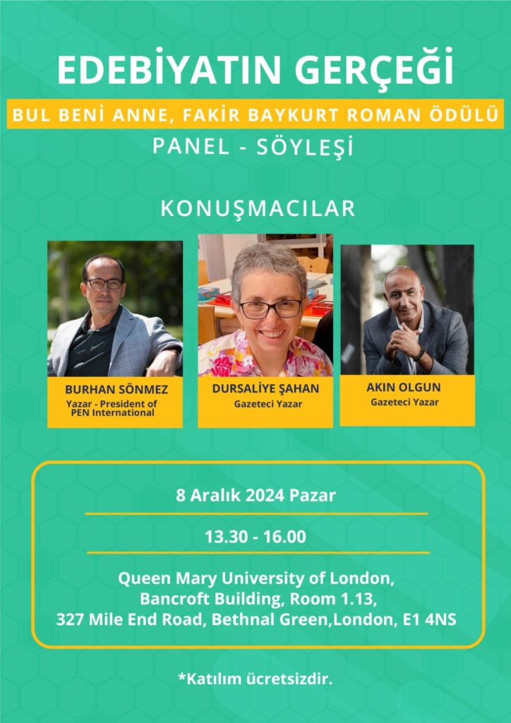 Girişin ücretsiz olduğu edebiyat toplantısı, Queen Mary Üniversitesi Bancroft Building, room 1.13 numaralı salonunda 13.30 – 16.00 saatlerinde yapılacaktır. (327 Mile End Road, Bethnal Green, London E1 4NS)