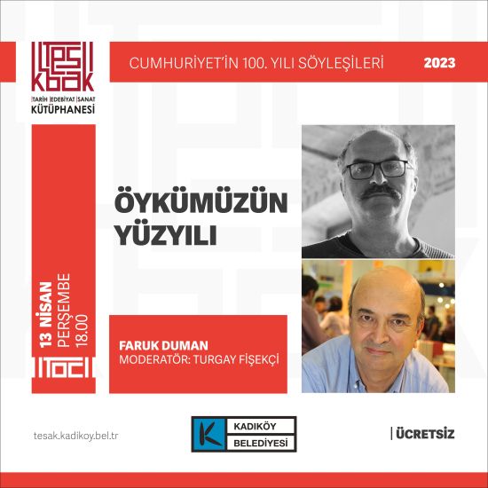 Turgay Fişekçi yürütücülüğünde düzenlenen Cumhuriyet’in 100. Yılı Söyleşileri’nde bu hafta Faruk Duman’la öykü sanatımızın son yüzyılındaki gelişmeler, büyük ustalar, gölgede kalanlar, genç kuşaklar ayrıntılarıyla konuşulacak, öykücülüğümüzün dünü ve bugününe pencereler açılacak.
