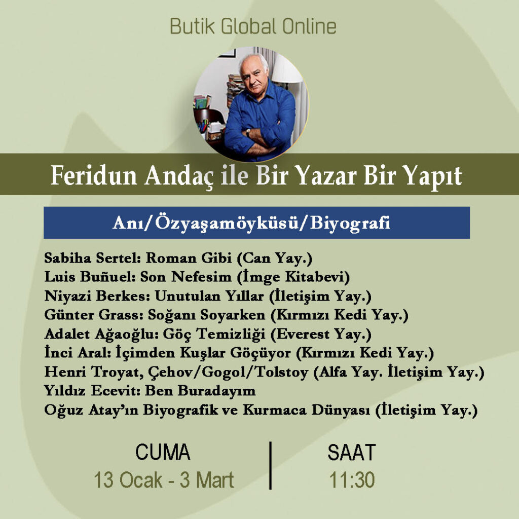 Feridun Andaç ile “Bir Yazar Bir Yapıt: Anı/Özyaşamöyküsü/Biyografi” atölyesi 13 Ocak-3 Mart tarihleri arasında Butik Global Online tarafından düzenleniyor.