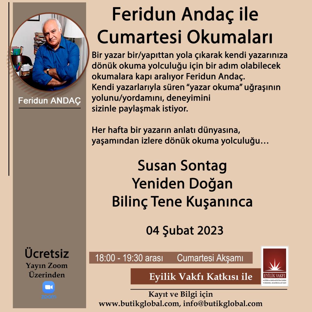 Feridun Andaç ile Cumartesi Okumaları: Susan Sontag çevrimiçi etkinliği, 4 Şubat Cumartesi ücretsiz olarak Butik Global Online tarafından düzenleniyor.