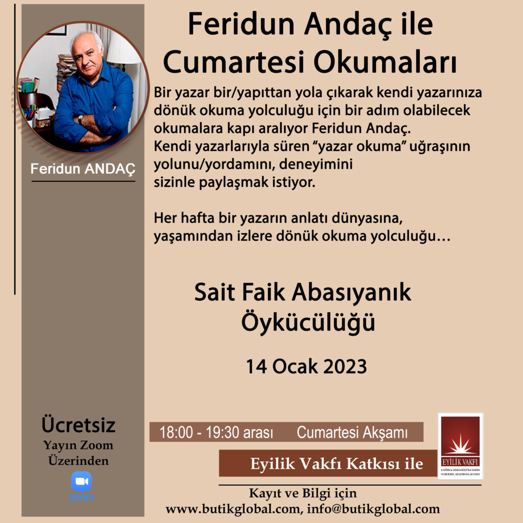 Feridun Andaç ile “Sait Faik Abasıyanık Öykücülüğü” çevrimiçi etkinliği, 14 Ocak Cumartesi ücretsiz olarak Butik Global Online tarafından düzenleniyor.