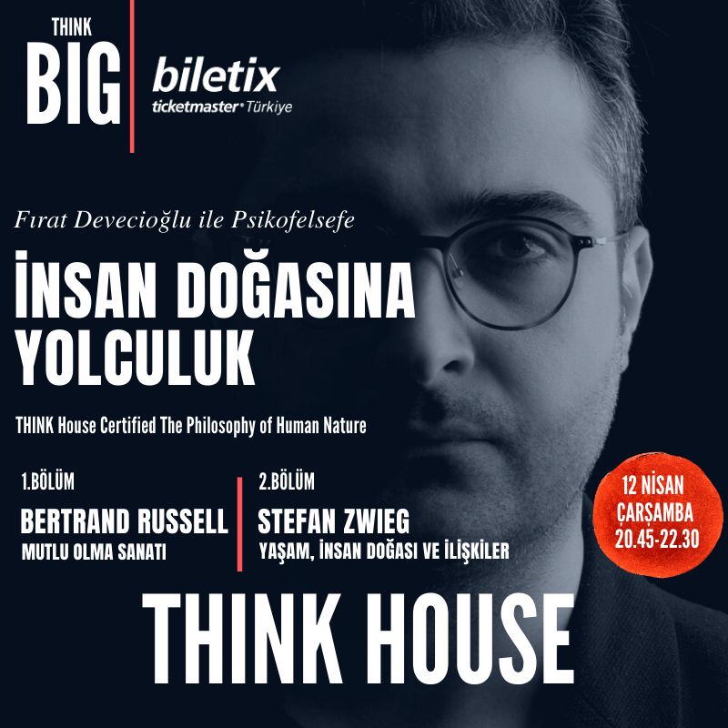 THINK House, 12 Nisan 20.45’te Fırat Devecioğlu ile İnsan Doğasına Yolculuk başlıklı atölye çalışmasına ev sahipliği yapacak. Hem THINK House’ta fiziksel olarak hem de çevrimiçi ortamda katılımın mümkün olduğu atölye, katılımcılarını Bertrand Russell ve Stefan Zweig’ın zengin düşünce dünyalarında bir yolculuğa çıkaracak.