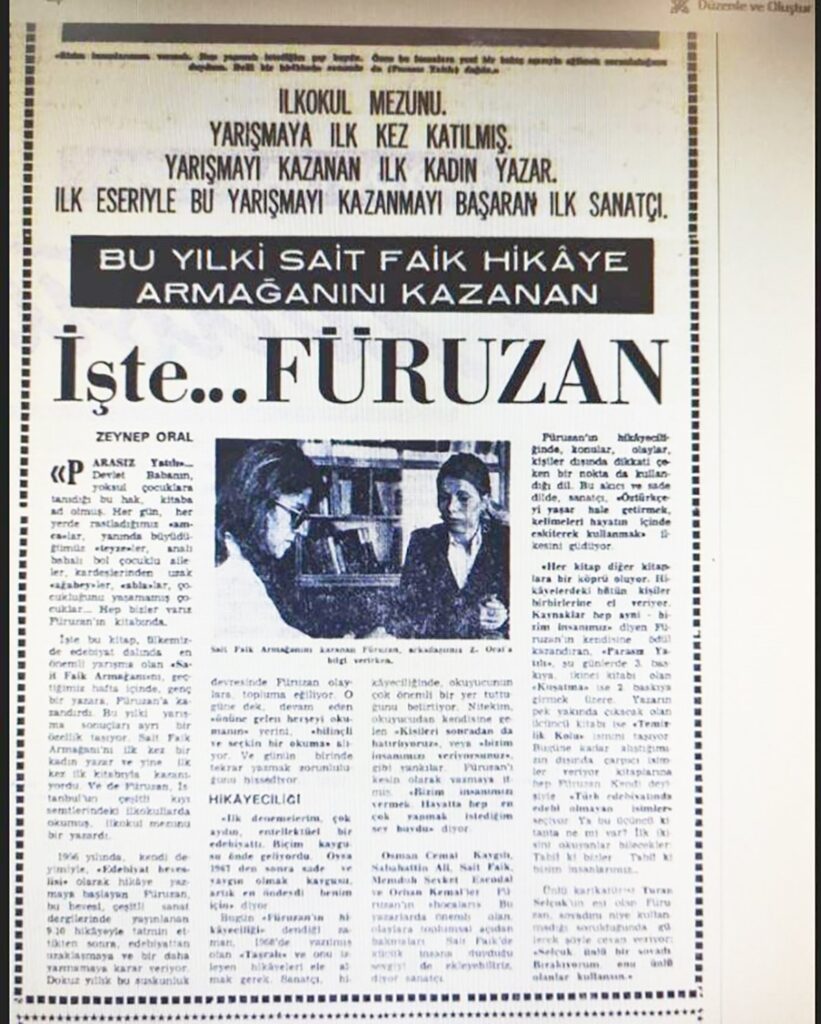 “İlk kitaplar kimi zaman önemli bir yazarın, bir yeteneğin sözcülüğünü de yaparlar. Bizde ve dünya edebiyatında bunun örnekleri çoktur” demiş Füruzan. İlk kitabın özgün, sanatsal açıdan güçlü olması gerektiğini düşünmüş o nedenle de ilk gençlik eserlerini dergilerde bırakmış ve “Parasız Yatılı”yı 1971’de yayınlamış. Bu güçlü çıkış da edebiyat dünyasında “Füruzan olayı” diye nitelenmiş ve bu ilk kitap Adnan Özyalçıner, Kâmuran Şipal gibi güçlü rakiplere rağmen en önemli öykü ödülünü, Sait Faik Hikâye Armağanı’nı kazanmış.