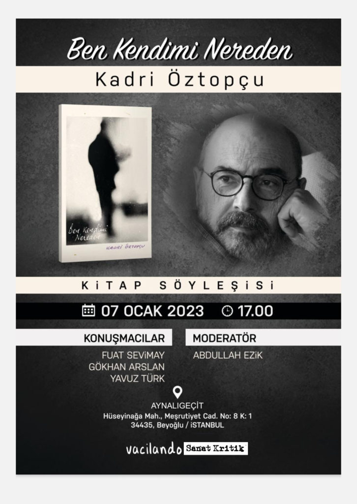 Fuat Sevimay, Gökhan Arslan ve Yavuz Türk, 7 Ocak Cumartesi günü saat 17.00’de Sanat Kritik’te Kadri Öztopçu’nun Vacilando’dan çıkan Ben Kendimi Nereden isimli şiir kitabı üzerine konuşacak. Moderatörlüğünü Abdullah Ezik’in üstlendiği söyleşi herkese açık ve ücretsizdir.