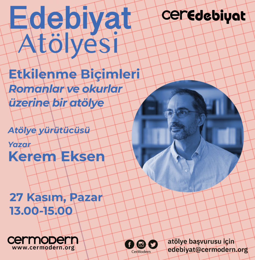 CerEdebiyat’ın düzenlediği Kerem Eksen ile “Etkilenme Biçimleri: Romanlar ve Okurlar Üzerine Bir Atölye” 27 Kasım Pazar 13.00-15.00 saatleri arasında yapılacak.