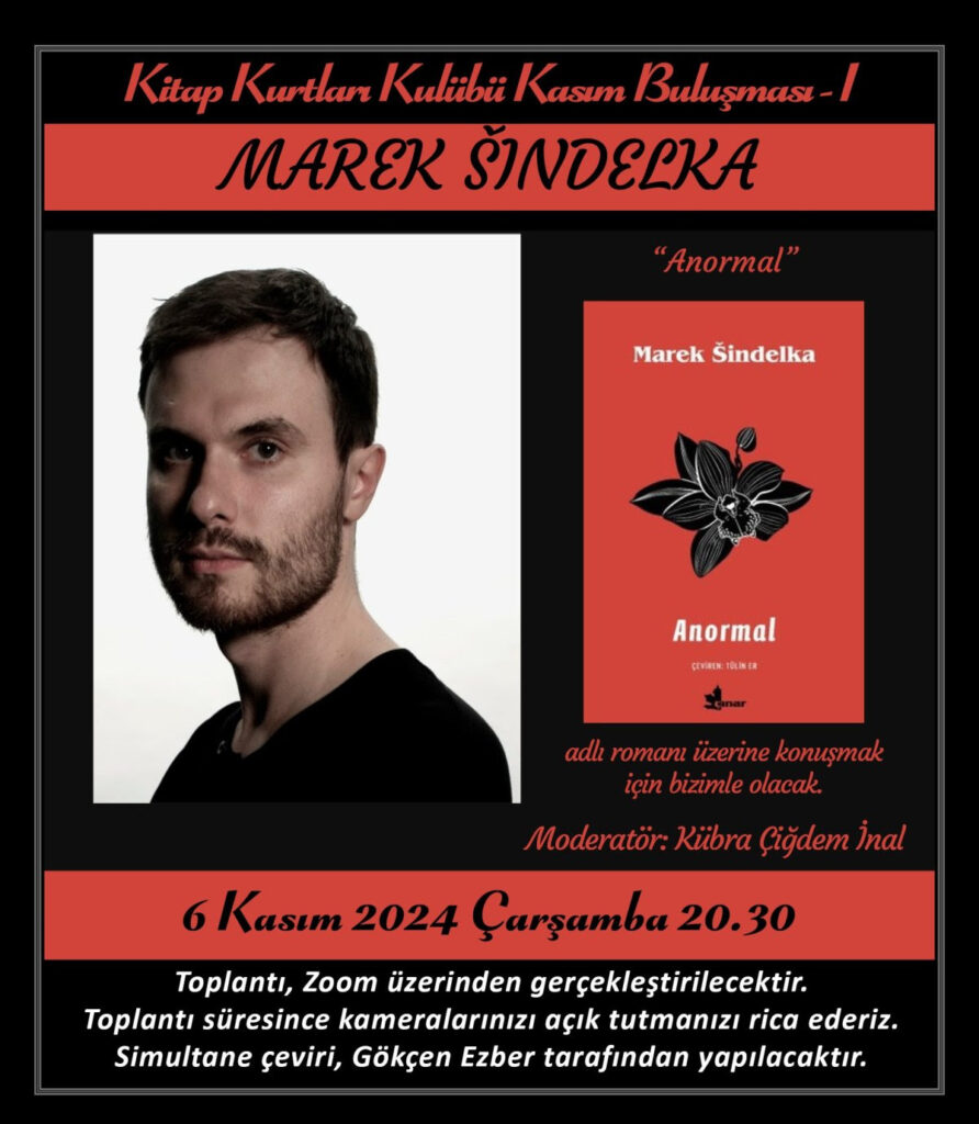 Kitap Kurtları Kulübü, edebiyat sohbetleri serisinin kasım ayı konuğu “Anormal ” ile Marek Šindelka olacak. Etkinlik Kübra Çiğdem İnal moderatörlüğünde Gökçen Ezber simultane çevirisiyle 6 Kasım çarşamba günü saat 20.30’da zoom üzerinden gerçekleşecek.