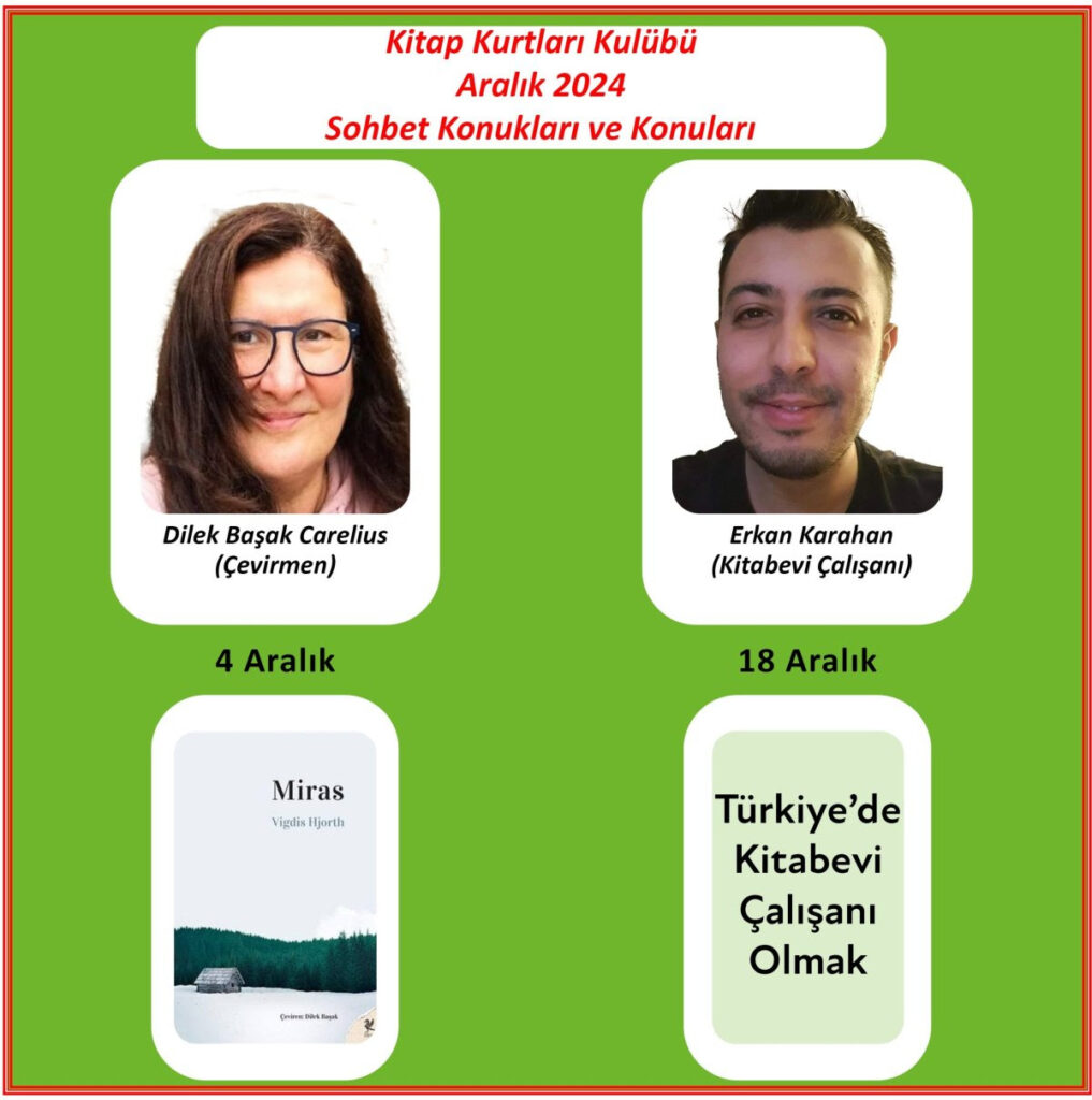 Kitap Kurtları Kulübü Aralık ayı programı belli oldu. 4 Aralık tarihinde Çağdaş Norveç edebiyatının en önemli romanlarından biri olarak kabul edilen Vigdis Hjorth’un Miras adlı kitabının çevirmeni Dilek Başak Carelius konuk olacak. 18 Aralık’ta ise Erkan Karahan Kitap Kurtları Kulübü’nün davetlisi olacak.