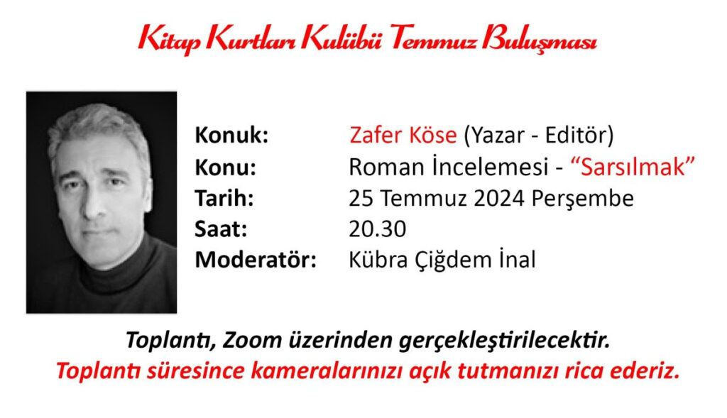 Kitap Kurtları Kulübü’nün düzenlediği etkinlik serisinin temmuz ayı konuğu yazar Zafer Köse. Kübra Çiğdem İnal moderatörlüğünde gerçekleşecek etkinlik 25 Temmuz’da saat 20.30’da Zoom üzerinden çevrimiçi olarak düzenlenecek.