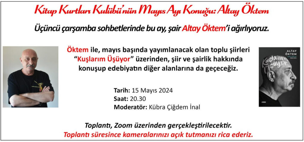 Kitap Kurtları Kulübü’nün her çarşamba düzenlediği etkinlik serisinin mayıs ayı konuğu şair ve yazar Altay Öktem olacak. Etkinlik Zoom üzerinden çevrimiçi olarak düzenlenecek.
