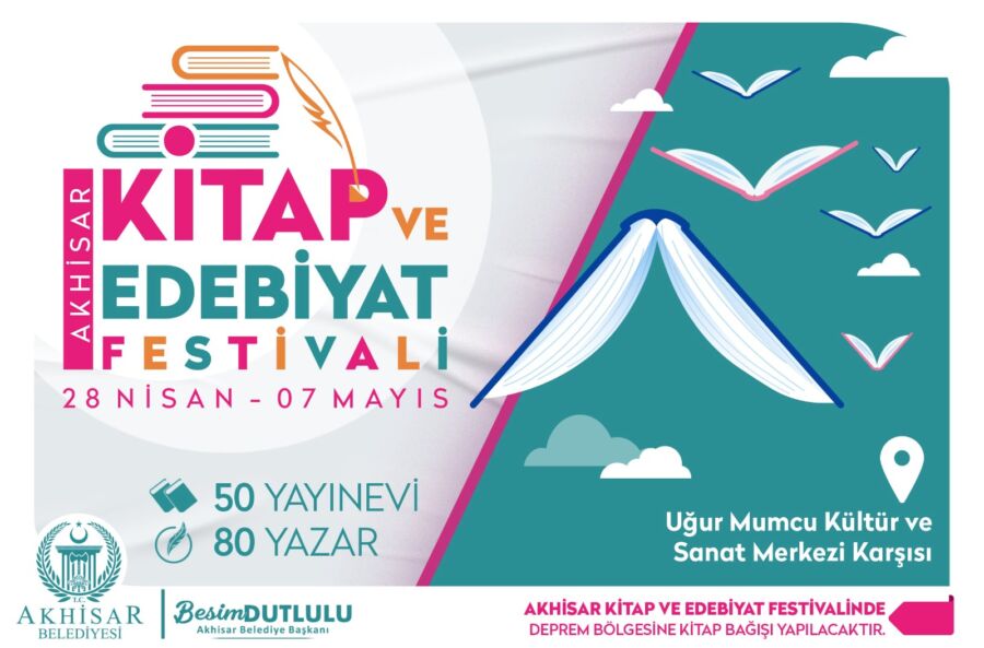 50 yayınevi ve 80 yazarın katılacağı Akhisar Belediyesi Kitap ve Edebiyat Festivali’nde, araştırmacı gazetecilerin, yazarların yanı sıra sanat dünyasının önemli isimleri de katılacak. Aynı zamanda düzenlenecek etkinlikte deprem bölgesine destek amaçlı bağış kampanyaları düzenlenecek.
