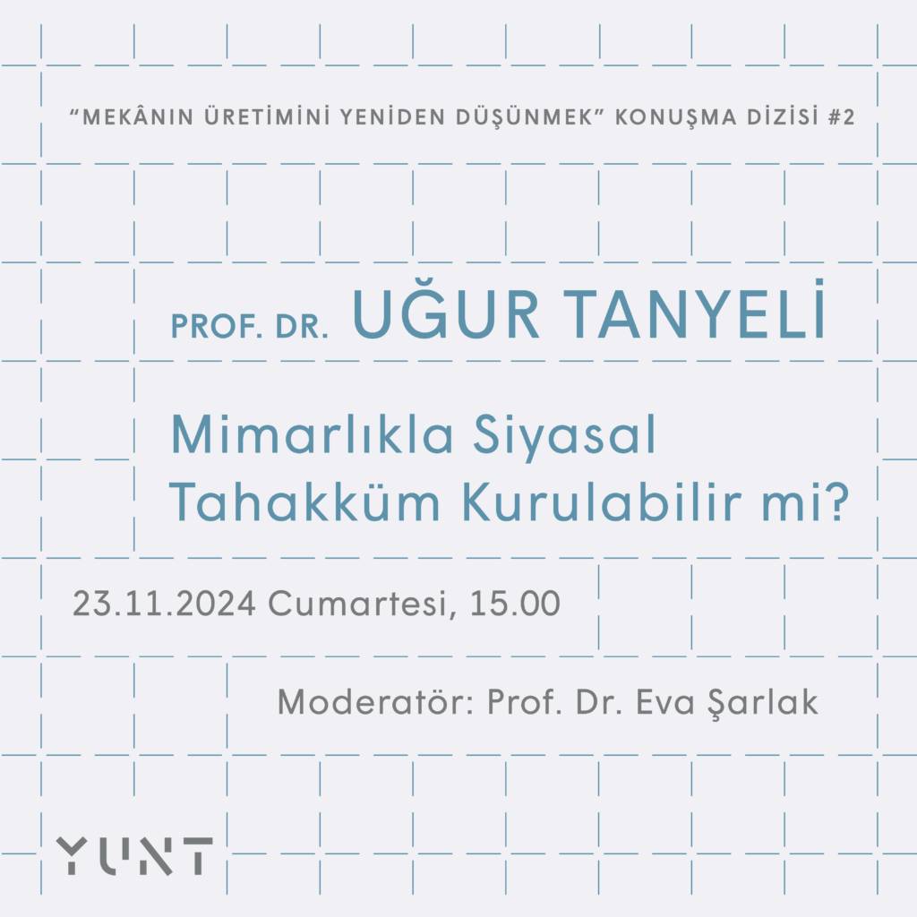 YUNT’un “Mekânın Üretimini Yeniden Düşünmek” başlıklı konuşma dizisi, Prof. Dr. Uğur Tanyeli ile devam ediyor. “Mimarlıkla Siyasal Tahakküm Kurulabilir mi?” başlıklı konuşma, 23 Kasım Cumartesi günü saat 15.00’te Prof. Dr. Eva Şarlak moderatörlüğünde gerçekleşecek.