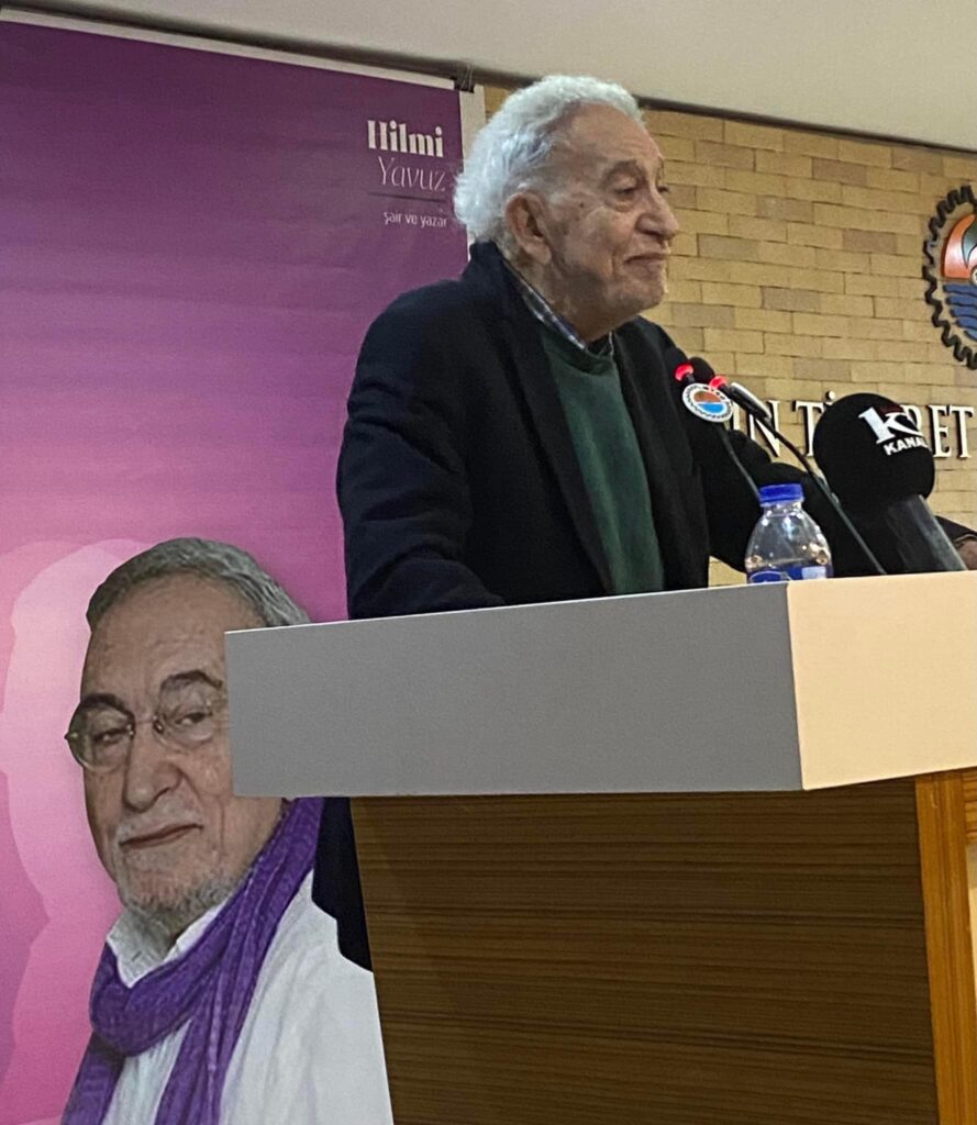 129 haftadır burada “Sanatta Düşünsel Pratikler” başlığıyla etkinlikler gerçekleştiren Celal Soycan’ın sunumundan sonra Hilmi Yavuz salonu tamamen doldurup, dışarıdaki balkona taşmış dinleyici topluluğuna üniversitedeki derslerini anımsatan kültürel yoğunlukta bir konferans verdi. Hoş sohbetiyle şiirden estetiğin sorunlarına, felsefeye uzandı, ezberden şiir örnekleri okudu.