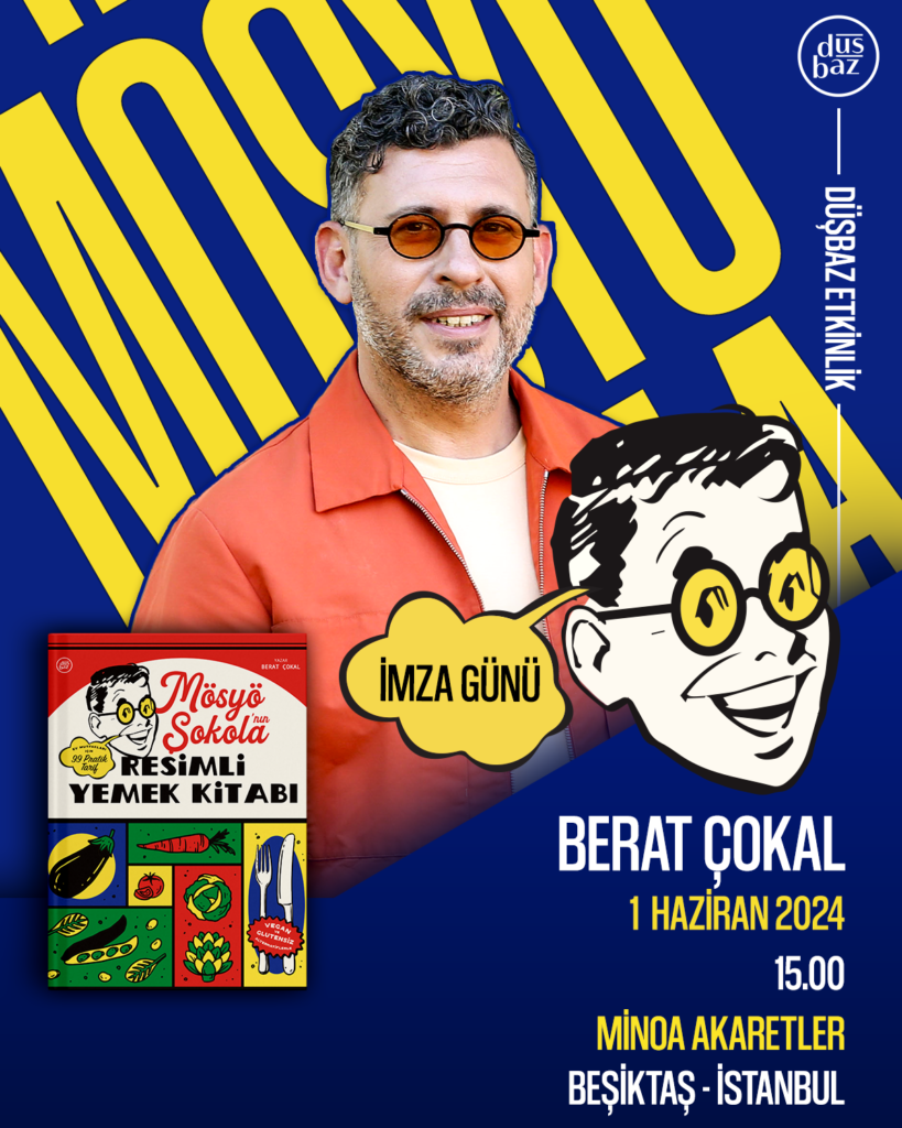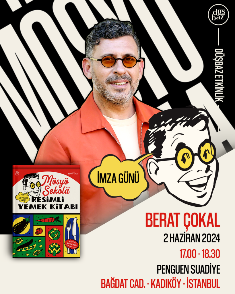 Berat Çokal, Düşbaz Kitaplar’dan çıkan Mösyö Şokola’nın Resimli Yemek Kitabı’nın yazarı Berat Çokal, okuyucularıyla bir araya geliyor. Çokal, 1 Haziran Cumartesi günü saat 15.00’te Minoa Akaretler’de, 2 Haziran Pazar günü 17.00’de Penguen Kitabevi Suadiye’de kitaplarını imzalayacak.