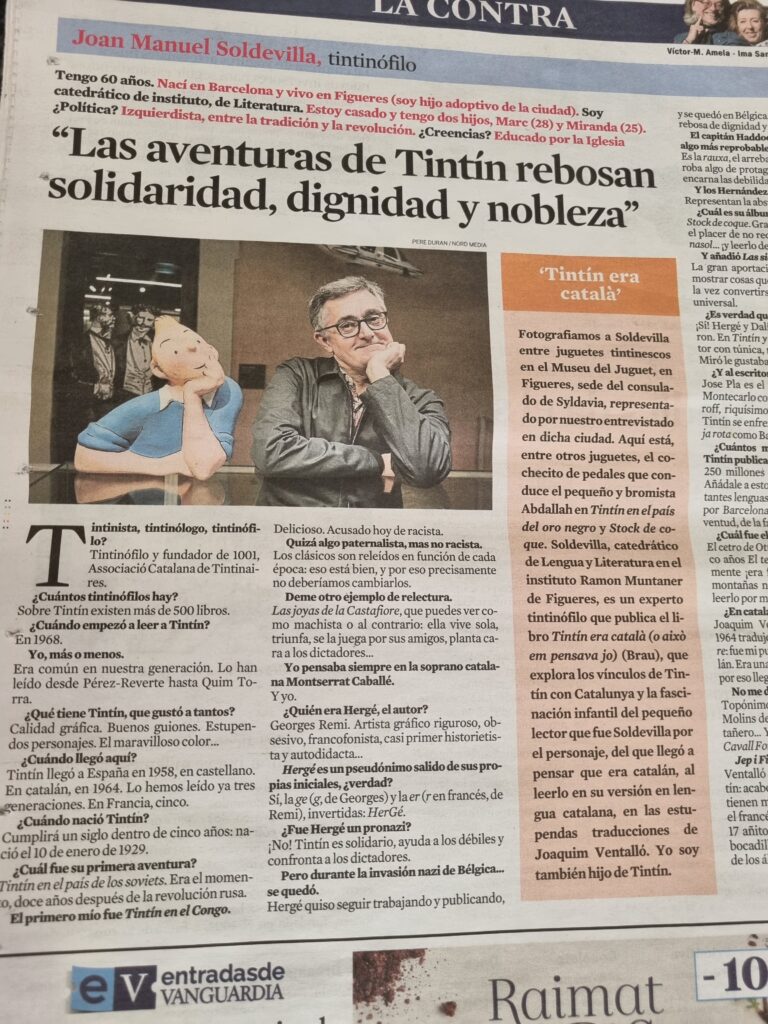 Tintinophile ve 1001 Katalan Tintinaires Derneği’nin de kurucusu olan muhabir yazar, Joaquim Ventalló’nun rafine bir Katalancayla yaptığı çeviriler sayesinde Tenten’in Katalan olduğuna inanmaya başladığını belirtir. Tenten’in çok sevilmesini de grafik kalitesi, iyi senaryo ve harika karakterler ve renk uyumunu örnek göstererek açıklar. La Vanguardia gazetesindeki söyleşiden dikkatimi çeken bölümü eklemesem bu yazıyı eksik hissedeceğim diyerek, minik bir anekdot olarak bırakıyorum. Böylece Tenten’in ilk zamanlardaki kolonyalist eleştirilerine ve benim çocukken onda bulduğum adalet arayışının nedensiz olmadığına bir yanıt olur.