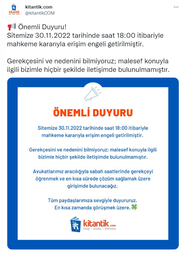“Önemli Duyuru! Sitemize 30.11.2022 tarihinde saat 18:00 itibariyle mahkeme kararıyla erişim engeli getirilmiştir. Gerekçesini ve nedenini bilmiyoruz; maalesef konuyla ilgili bizimle hiçbir şekilde iletişimde bulunulmamıştır.”