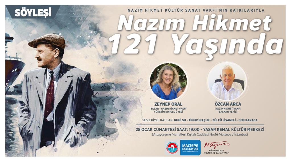 Nâzım Hikmet Kültür ve Sanat Vakfı katkılarıyla ve Maltepe Belediyesi iş birliğinde 28 Ocak Cumartesi, saat 19.00’da Maltepe Belediyesi Yaşar Kemal Kültür Merkezi’nde “Nâzım Hikmet 121 Yaşında” etkinliği düzenleniyor.