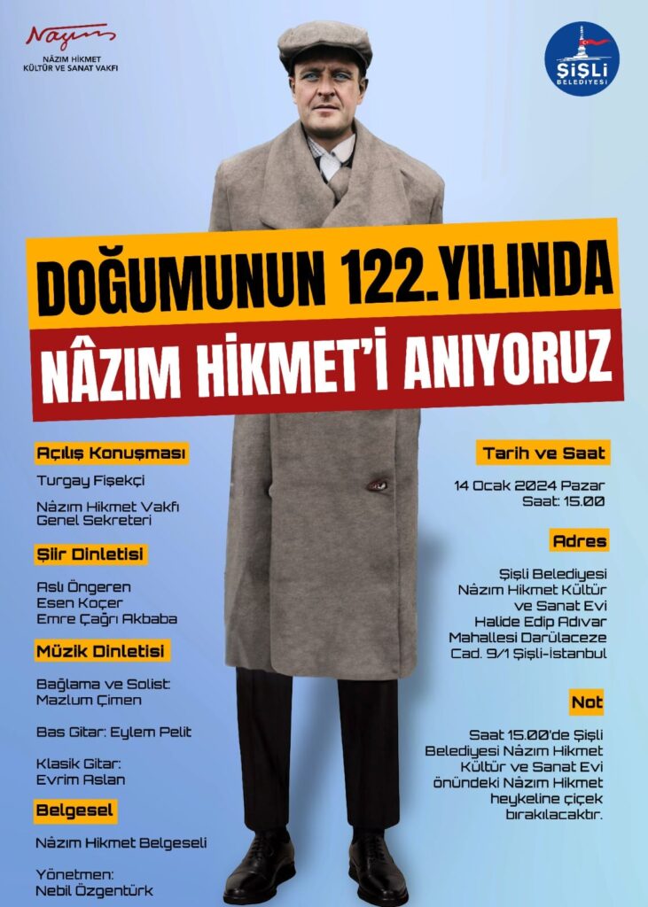Nâzım Hikmet, 122. doğum gününde İstanbul’da 2 gün sürecek etkinliklerle anılacak. İlk etkinlik 14 Ocak Pazar günü saat 15.00’te, Nâzım Hikmet Kültür ve Sanat Vakfı– Şişli Belediyesi iş birliğinde Şişli Nâzım Hikmet Kültür ve Sanat Evi‘nde gerçekleştirilecek. Anma Vakıf Genel Sekreteri Turgay Fişekçi’nin açılış konuşmasıyla başlayacak, Aslı Öngören, Esen Koçer, Emre Çağrı Akbaba’nın şiir okumalarının ardından Mazlum Çimen dinletisiyle devam edecek. Çimen’e basgitarda Eylem Pelit, klasik gitarda Evrim Aslan eşlik edecek. Program, Nebil Özgentürk’ün hazırladığı Nâzım Hikmet Belgeseli’nin gösterimiyle sona erecek.