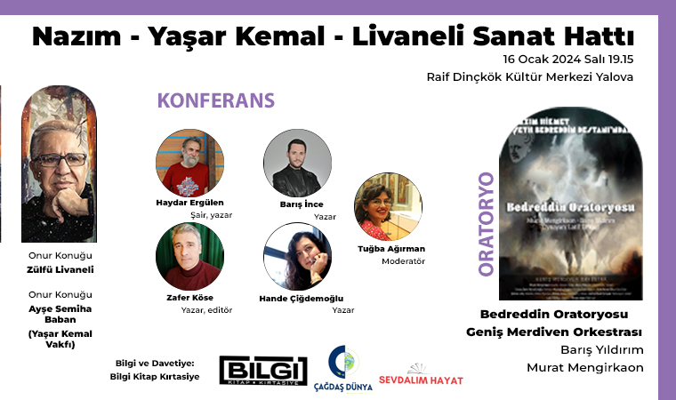 Nazım-Yaşar Kemal-Livaneli Sanat Hattı semineri ve Bedrettin Oratoryosu 16 Ocak Salı (bugün) 19.15’te Yalova Raif Dinçkök Kültür Merkezinde düzenleniyor.