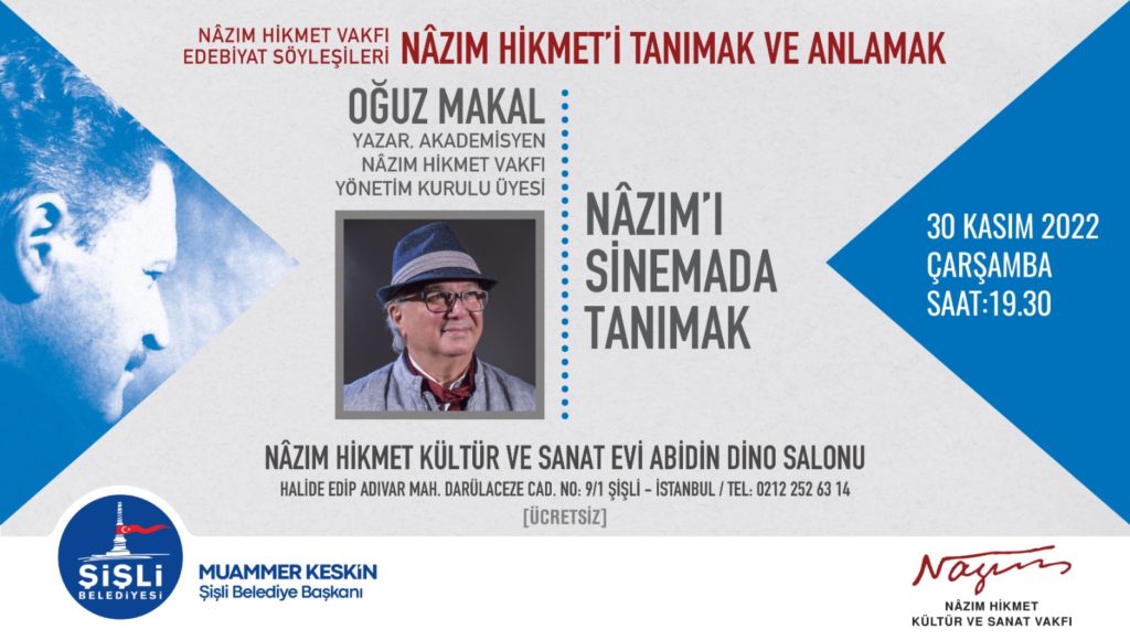30 Kasım 2022 günü saat 19.30’da Şişli Belediyesi Nâzım Hikmet Kültür ve Sanat Evi Abidin Dino Salonu’nda gerçekleşecek. ““Nâzım’ı Sinemada Tanımak” başlıklı söyleşide Oğuz Makal, henüz yirmili yaşlarda sinema ile tanışan Nâzım Hikmet’in edebi yaşamında oluşturduğu izleri anlatacak.