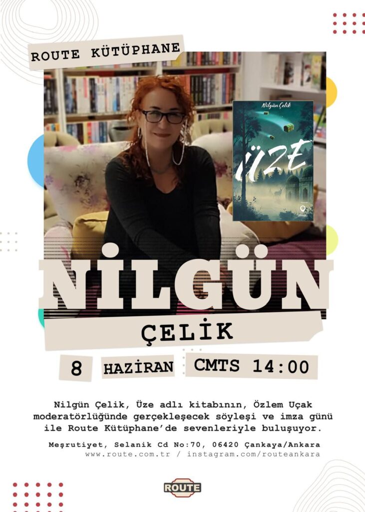Nilgün Çelik, 8 Haziran saat 14.00 Kütüphane Route’ta okuyucularıyla buluşuyor. Çelik’in son kitabı üzerine gerçekleşecek etkinliğin moderatörü Özlem Uçak. Kütüphane Route, Ankara’da, Selanik Caddesi’nde bulunuyor.