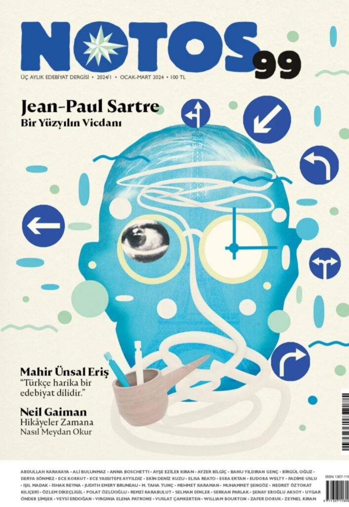 Notos yaptığı bütün yazar dosyalarını kalıcı bir kaynağa dönüştüren anlayışıyla Ocak-Mart, 99. sayısında Jean-Paul Sartre’a yöneliyor. Kendisinde pek çok anlamı birden birleştiren filozof, yazar, düşünür… Bir yüzyılın vicdanı. Bir başına Varlık ve Hiçlik yazıldığı günden bugüne döne döne okunur. Romanları, öyküleri, yaşamöyküsü, elbette oyunları. Adeta yazı için doğmuştu. Görme yetisi zayıflamaya başladıktan sonra yazıyla ilişkisini gözden geçirmişti. Sartre’dan söz edince onun eylem insanı kişiliği de hemen önümüze gelir. Elbette yirminci yüzyılın en önemli entelektüellerindendi. Notos’un Jean-Paul Sartre dosyasında Zeynel Kıran, Nedret Öztokat Kılıçeri, Judith Emery Bruneau, Ayşe Eziler Kıran, William Bourton, M. Taha Tunç, Anna Boschetti, Elisa Reato, Ece Korkut, Ece Yassıtepe Ayyıldız ve Jean-Paul Sartre’ın yazıları; Virginia Elena Patrone ile Vuslat Çamkerten’in desenleri yer alıyor.