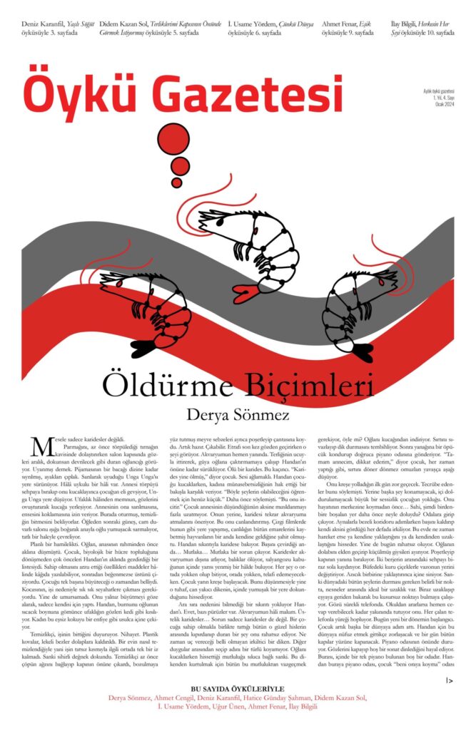 Öykü Gazetesi’nin dördüncü sayısında; Derya Sönmez, Ahmet Cengil, Deniz Karanfil, Hatice Günday Şahman, Didem Kazan Sol, İ. Usame Yördem, Uğur Ünen, Ahmet Fenar ve İlay Bilgili’nin öyküleri var.