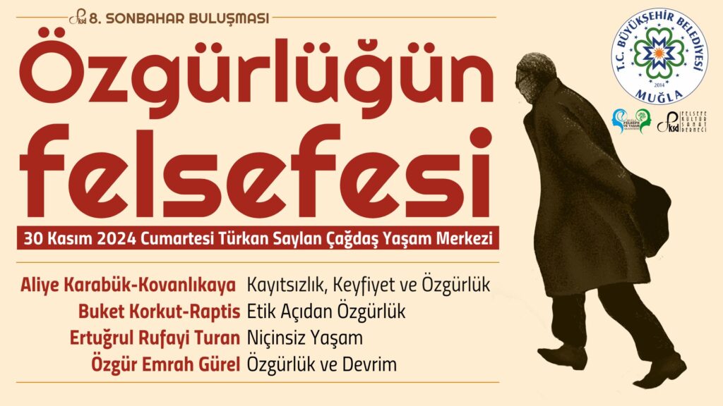 Felsefe Kültür Sanat Derneğinin (FKSD) 2015’ten itibaren düzenli olarak sürdürdüğü FKSD Sonbahar Buluşmalarının sekizincisine bu yıl Muğla Büyükşehir Belediyesi ev sahipliği yapıyor. Özgürlüğün Felsefesi ana başlığıyla önümüzdeki cumartesi Türkan Saylan Çağdaş Yaşam Merkezinde gerçekleştirilecek buluşmada Prof. Dr. Aliye Karabük-Kovanlıkaya, Prof. Dr. Buket Korkut-Raptis, Prof. Dr. Ertuğrul Rufayi Turan ve Dr. Özgür Emrah Gürel konuşmacı olarak yer alacak.