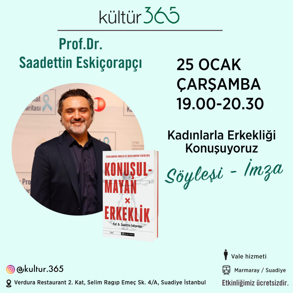 Prof. Dr. Saadettin Eskiçorapçı, ezber bozan kitabı Konuşulmayan Erkeklik çerçevesinde 25 Ocak Çarşamba akşamı saat 19.00’da Kültür 365’te düzenlenen “Kadınlarla Erkekliği Konuşuyoruz” başlıklı söyleşi ve imza gününde okurlarıyla buluşacak. Epsilon’dan çıkan Konuşulmayan Erkeklik’te Prof. Dr. Eskiçorapçı, erkeklerin anlatmaktan çekindiği sorunlarına, konuşulmayan ve hatta tabu sayılan erkek hastalıklarına ışık tutuyor. “Erkekler konuşmaya başlayacaksa bu, kadınlar sayesinde olacak,” diyen başarılı hekim, kitabının sadece erkekler için değil, çevresindeki erkekleri anlamak isteyen kadınlar için de çok önemli bir kaynak olduğuna da dikkat çekiyor.