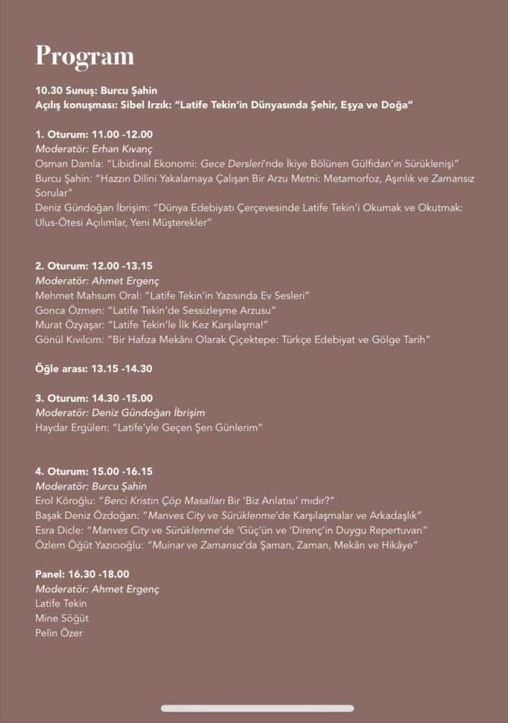 Latife Tekin edebiyatını bütün yönleriyle incelemeyi hedefleyen Latife Tekin Sempozyumu, akademisyenleri, yayın dünyasının önde gelen isimlerini ve yazarları bir araya getirecek. Sempozyumun kapanış panelinde Latife Tekin de yer alacak. Karaköy Minerva Palas’ta düzenlenecek olan sempozyum herkese açık ve ücretsiz olacak.