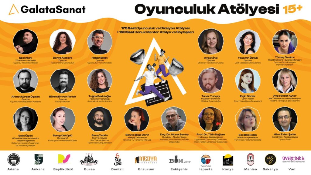 Türkiye’nin en köklü sanat merkezlerinden Galata Sanat Merkezi, Türkiye genelinde düzenleyeceği oyunculuk atölyeleriyle sanatseverlerle buluşmaya hazırlanıyor. İstanbul başta olmak üzere Ankara, İzmir, Eskişehir, Manisa, Denizli, Antalya, Isparta, Mersin, Adana, Gaziantep, Malatya, Van, Erzurum, Konya ve Bursa gibi 16 şehirde eş zamanlı olarak başlayacak atölyeler, Türkiye’nin dört bir yanında sanatsal bir rüzgâr estirmeyi hedefliyor.